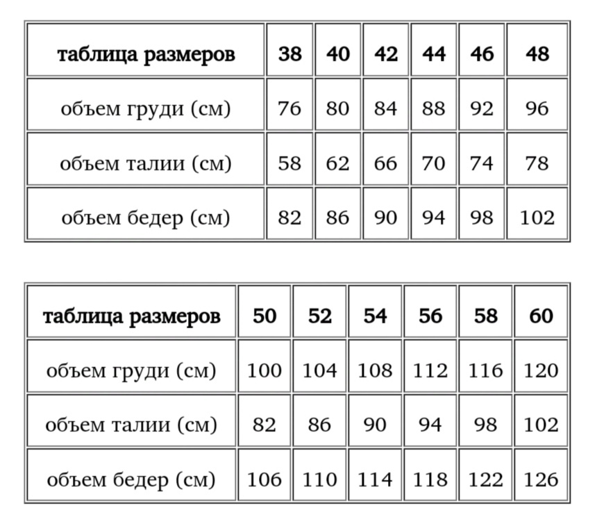 Размеры доступные для заказа на производстве